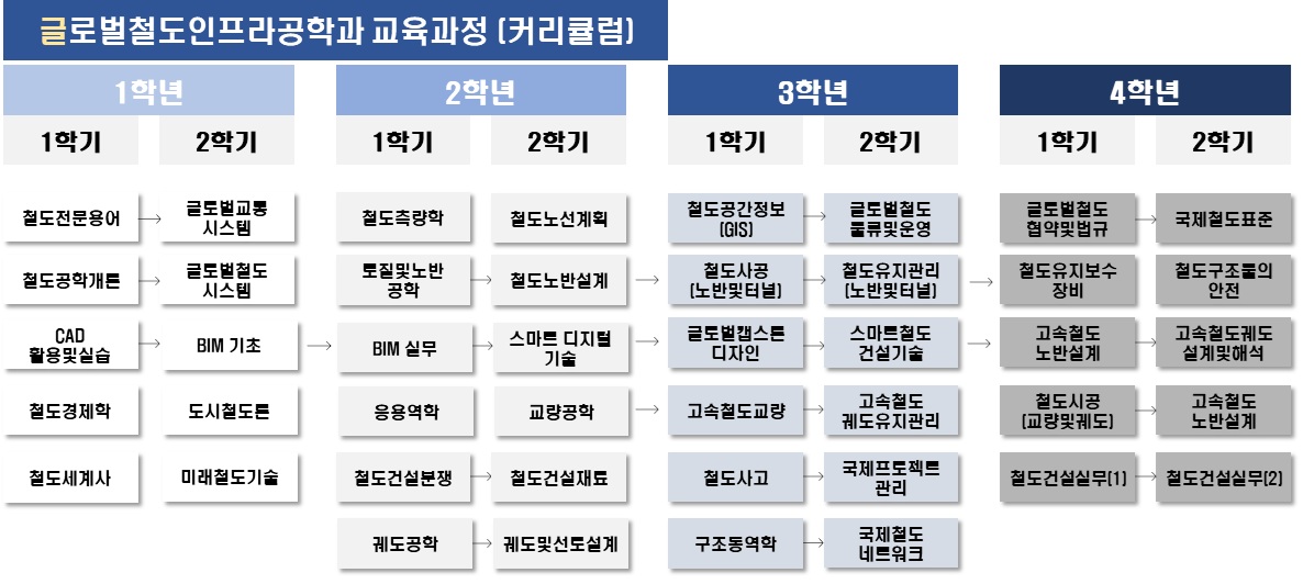 이 과목에서는 글로벌 철도 시스템의 발전과 각국의 철도 산업에 대해 다룬다. 철도의 기술적, 경제적, 사회적 중요성을 이해하고, 다양한 국가와 지역에서의 철도 운영 시스템을 비교한다. 또한, 철도 운행의 표준화, 글로벌 철도 연계 및 효율적인 운영 방안을 배웁니다. 이를 통해 글로벌 철도 시스템의 동향을 이해하고, 다양한 철도 시스템을 융합하고 개선하는 능력을 기를 수 있다.